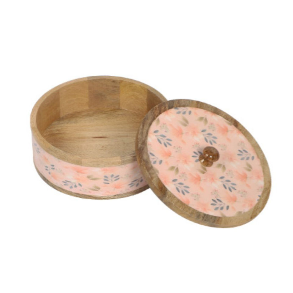 Handcrafted Mango Wood Roti Box with Floral Enamel Lid Traditional Indian Chapati Hot Pot Casserole for Kitchen & Dining