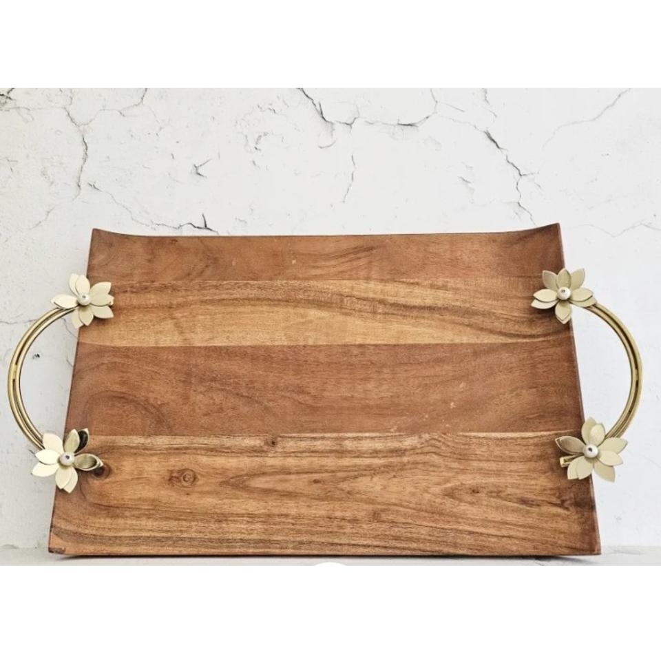Handcrafted Mango Wood Serving Tray Eco-Friendly Brass Butterfly Handle Floral for Hotel Catering-Food Serving Dinner Ware