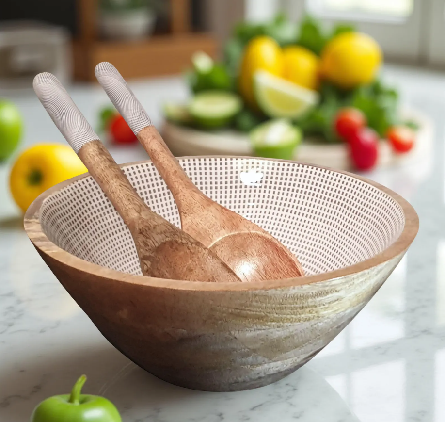 Handcrafted Mango Wood and enamel Coated Salad Bowl with Spoon and Fork Decorative Wooden Serving Set for Salads & Fruits