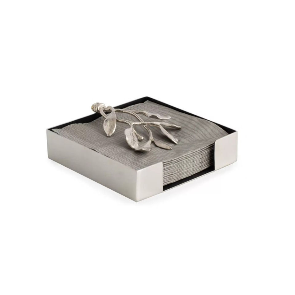 Handcrafted Metal Napkin Holder With White Orchid Flower Design Silver Finish Decorative Napkin Holder Tissue Organizer On Sale