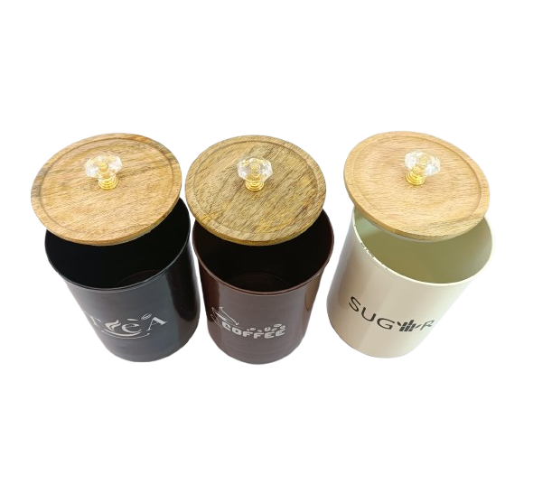 Handcrafted Metal Tea Coffee & Sugar Canister Set with Wooden Lid Beautiful Home Kitchen Restaurant Food Storage & Container