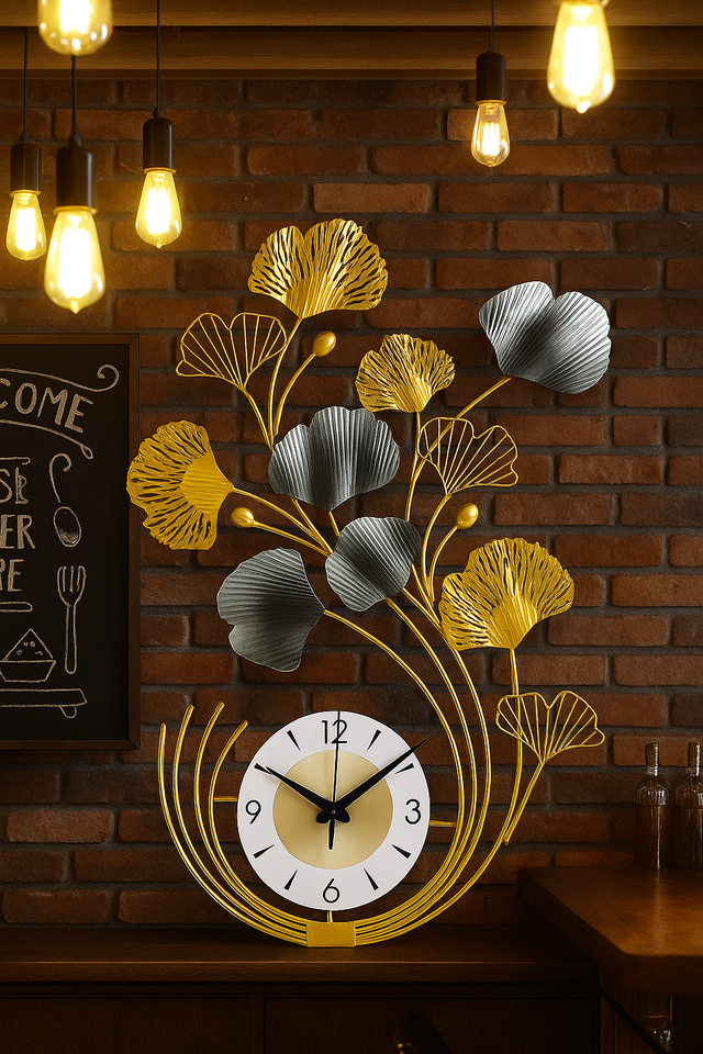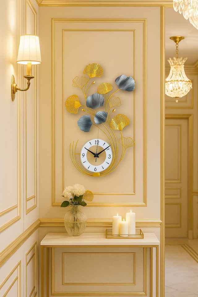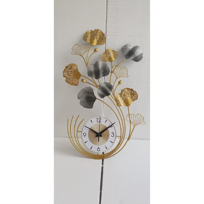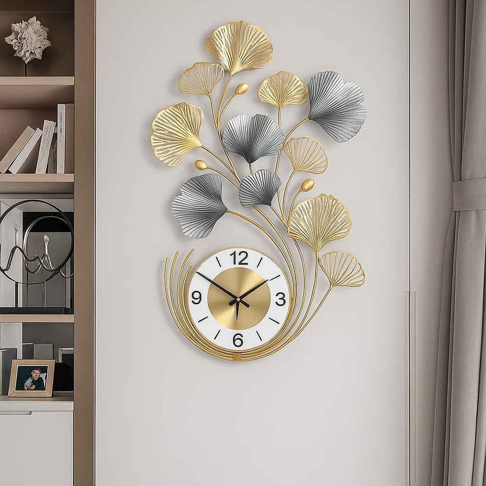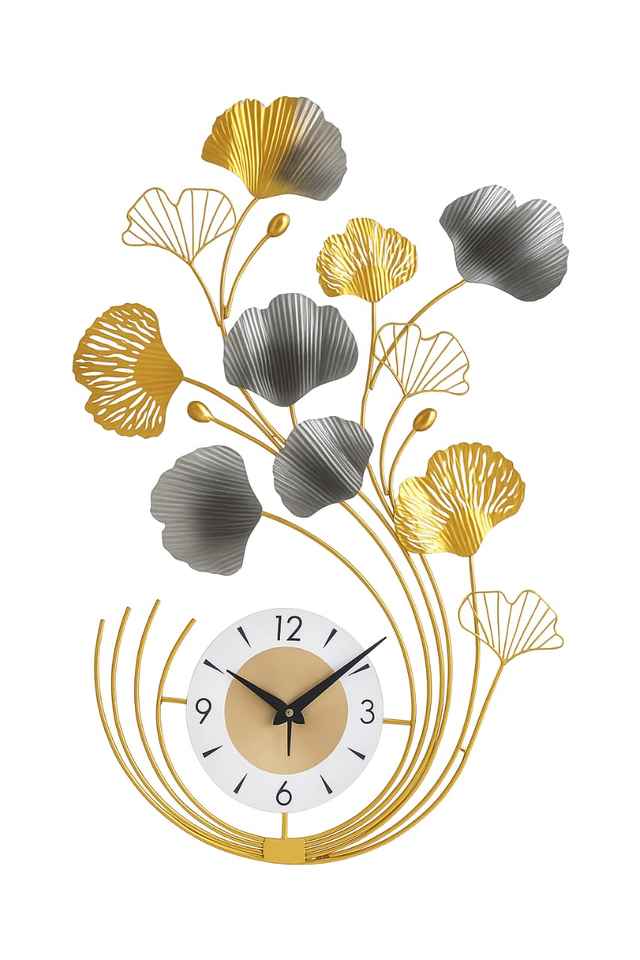 Handcrafted Modern Luxury Metal Wall Clock Golden & Grey Floral Leaf Design for Living Room & Home Office Decor