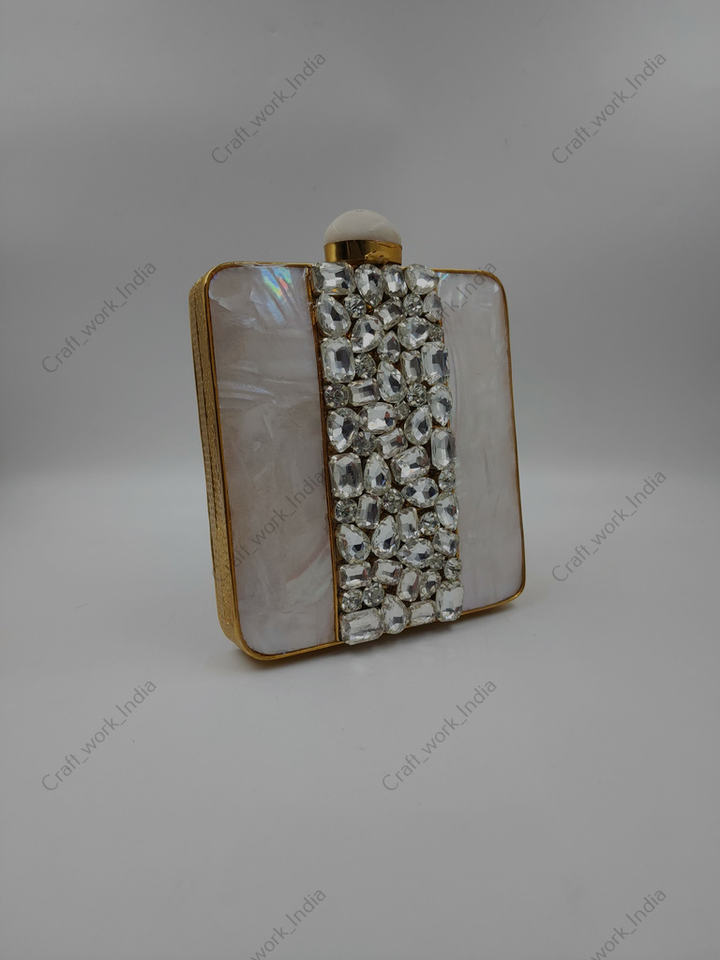 Handcrafted Mother of Pearl Clutch Bag with Crystal Stone Embellishment Luxury Evening Party Wedding Handbag for Women