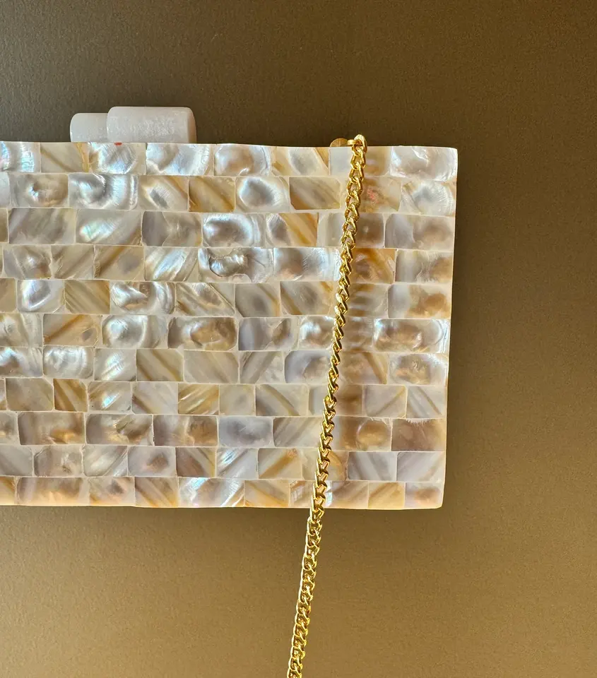 Handcrafted Mother of Pearl Clutch Purse Elegant Gold Chain Iridescent Mosaic Evening Bag for Special Occasions on Sale