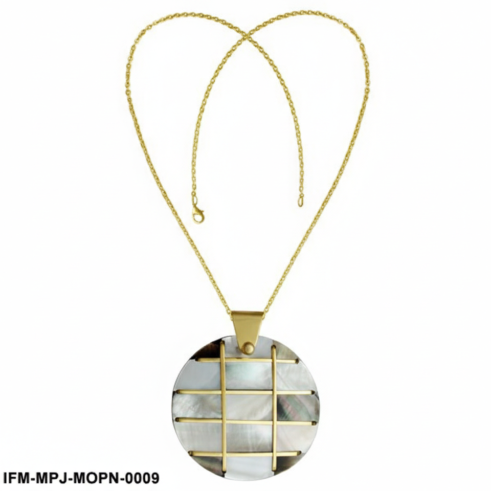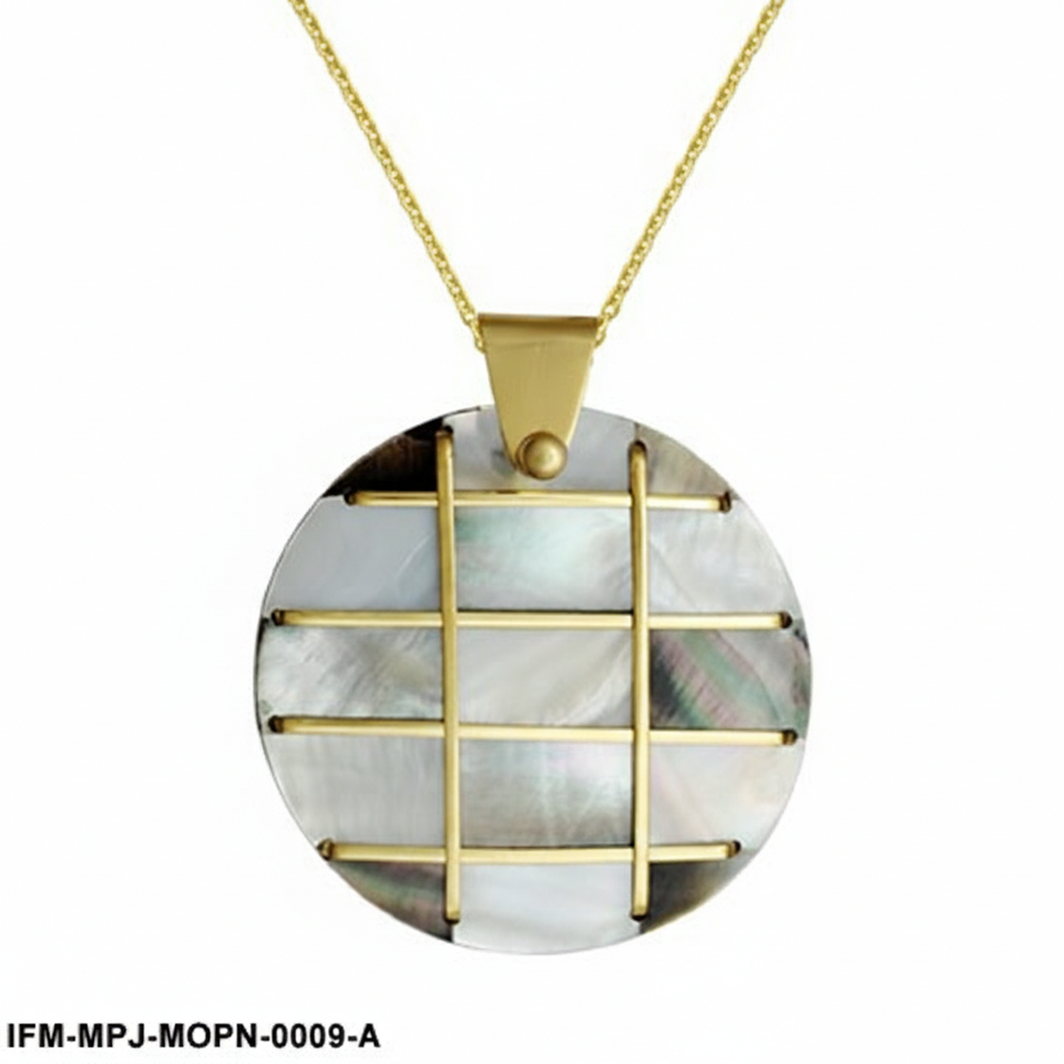 Handcrafted Mother of Pearl Grid Pendant Necklace Iridescent Shell Round Medallion in Gold-Tone Geometric Frame