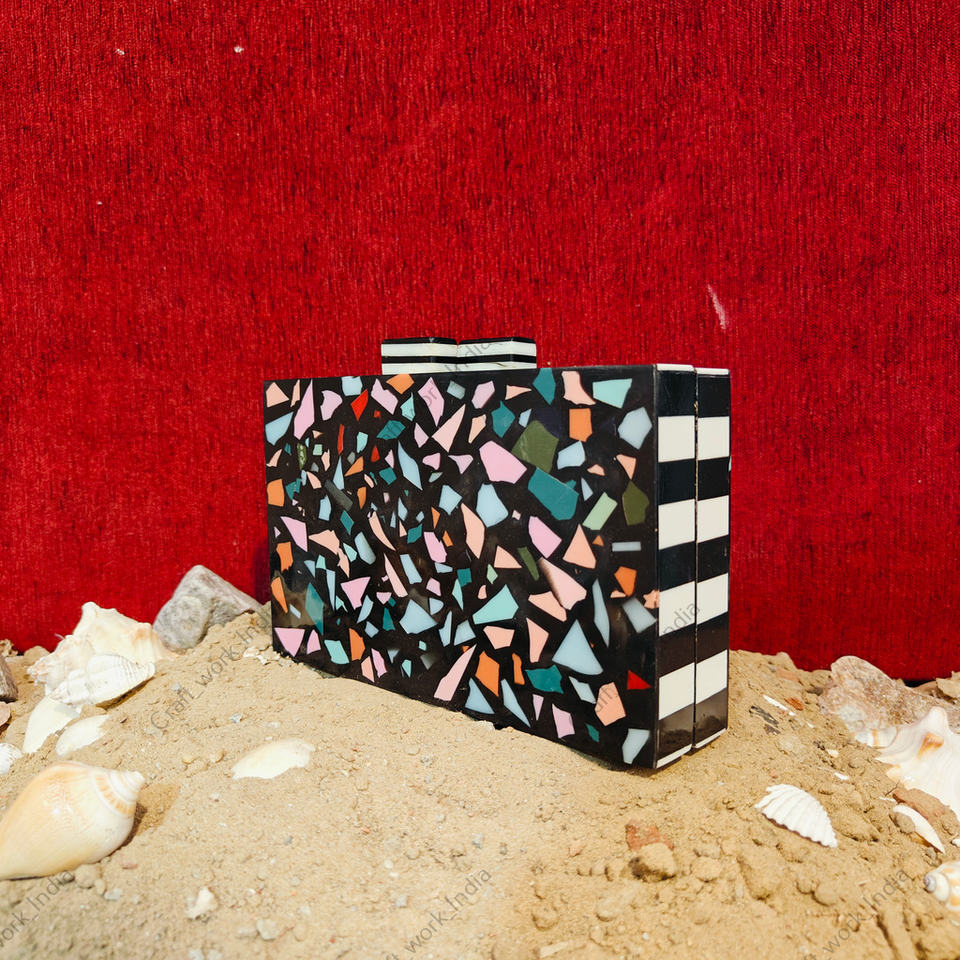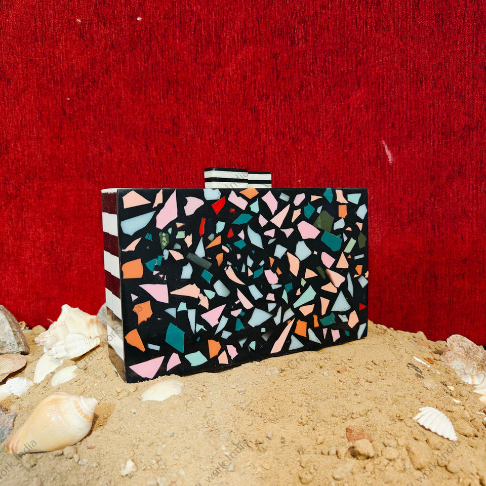 decoration:Multicolor resin fragments inlaid on black base with polished hard-shell finish, creating a bold artistic mosaic effect
