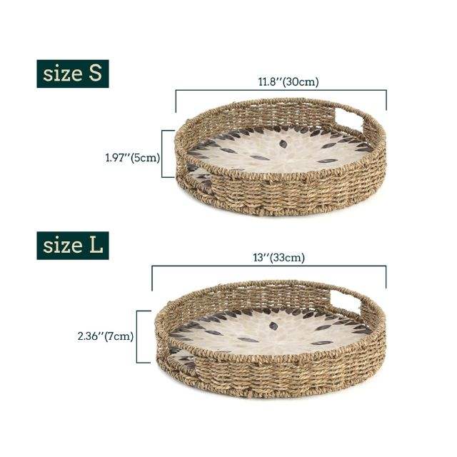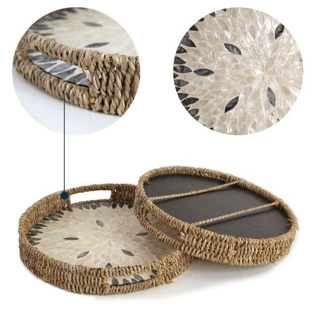 Seagrass MOP inlay round serving tray with handle set of 2 sizeProduct name