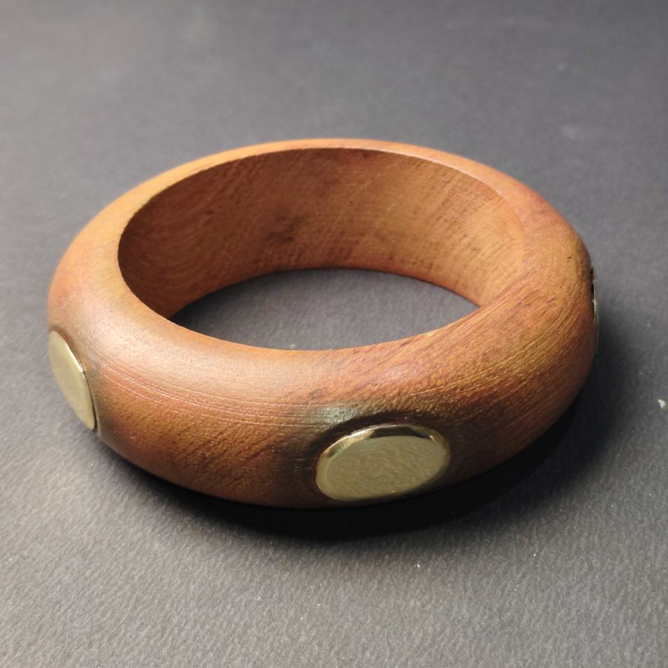 Handcrafted Natural Solid Wood Bangle with Inlaid Brass Oval Disks - Bohemian Style Chunky Wooden Bracelet for Women