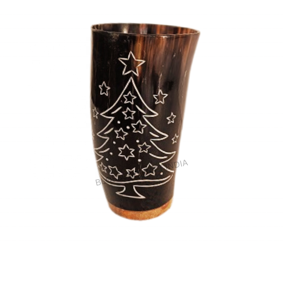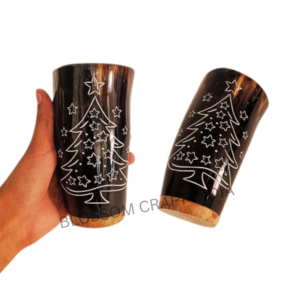 Handcrafted Nautical Glass Buffalo Drinking Horn Cup Carved Christmas Tree Design Unique Ox Viking Horn Mug Tumbler Stylish