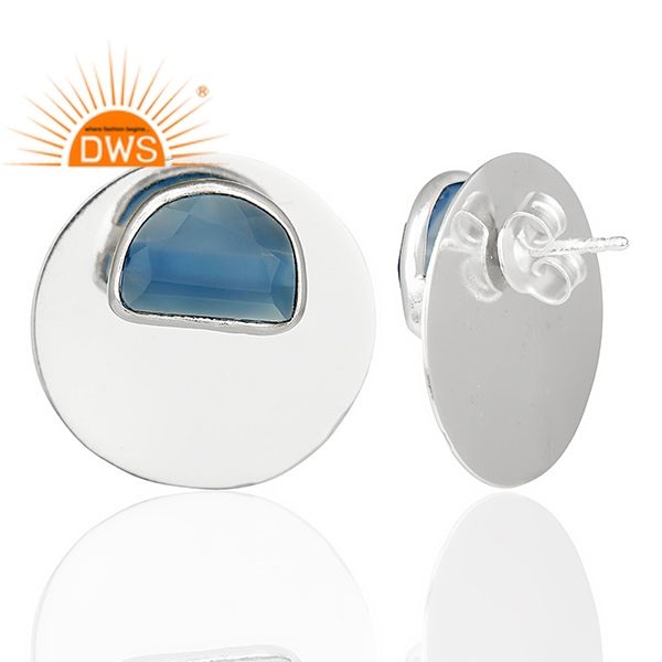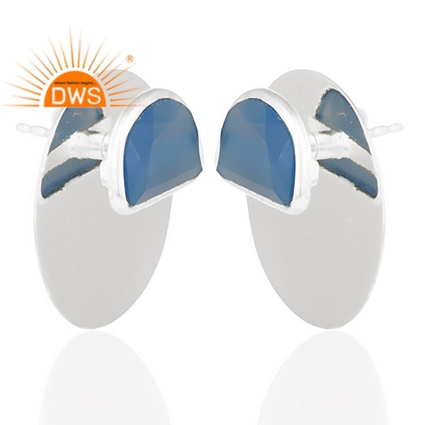 Handcrafted Newly Arrived Blue Chalcedony Gemstone Earrings Round Sterling Fine Silver Stud Earring Supplier Jewelry