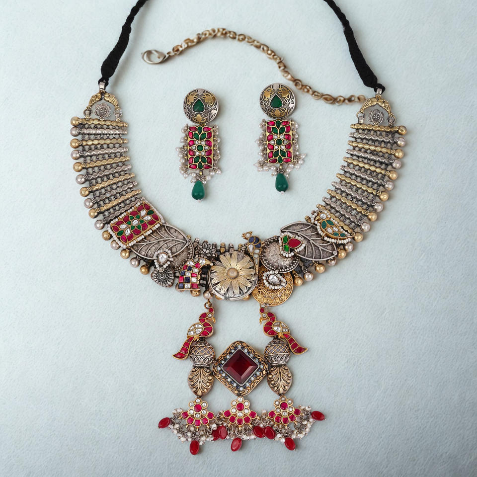 Handcrafted Oxidized Silver Ethnic Tribal Jewelry Set Classic Style Necklace with Red Kundan Accents