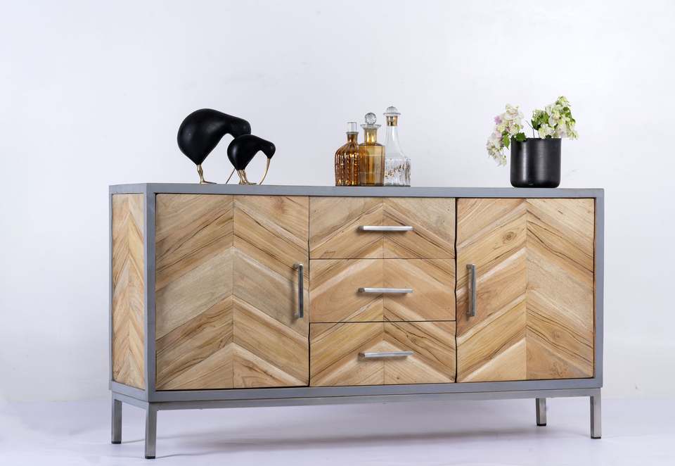 Handcrafted Premium Mango Wood Sideboard Stainless Steel Frame Two Spacious Doors Three Drawers Dining Room Living Room Storage