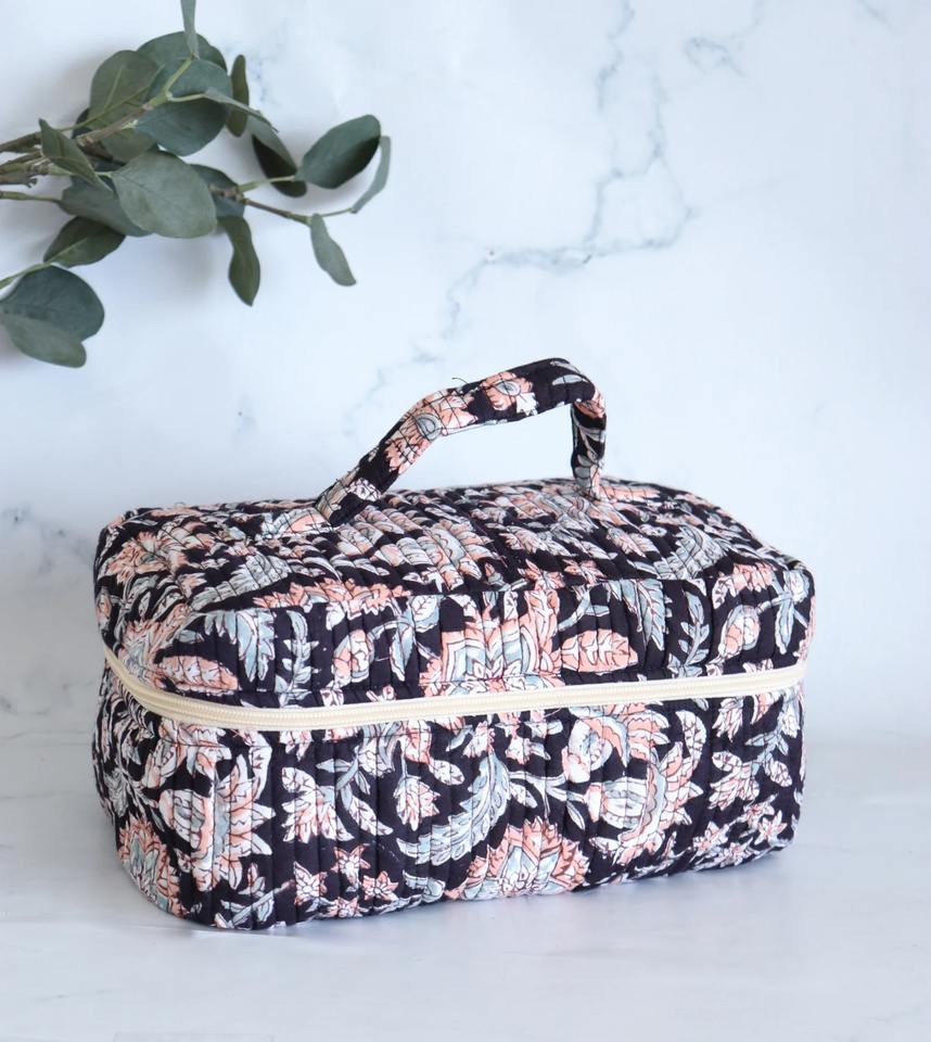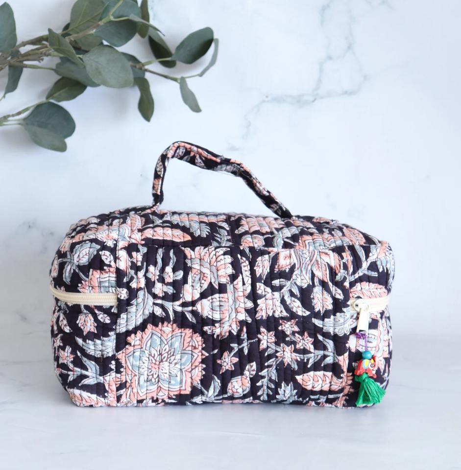 Handcrafted Quilted Eco-Friendly Vintage Black Floral Block Print Cotton Zipper Water-Resistant Cosmetic Organizer Vanity Bag