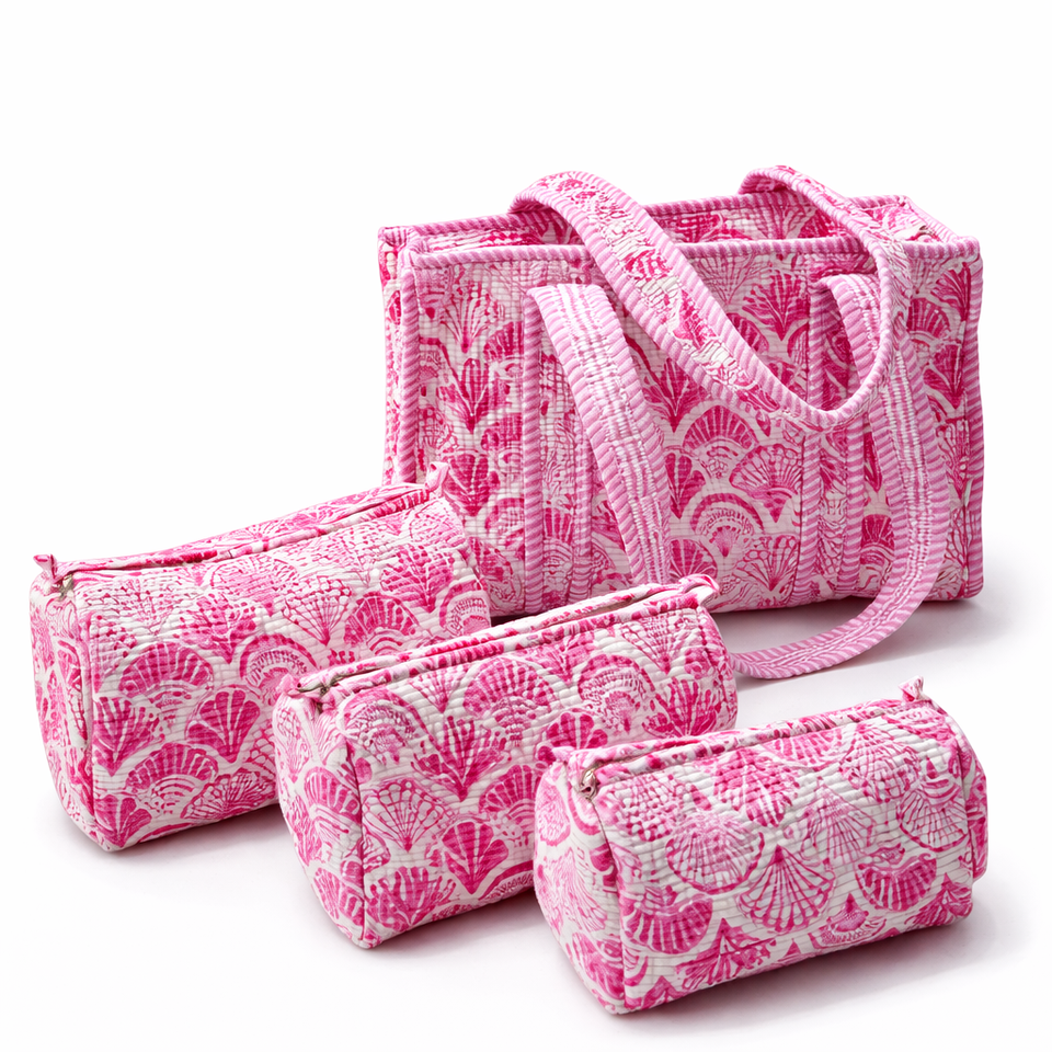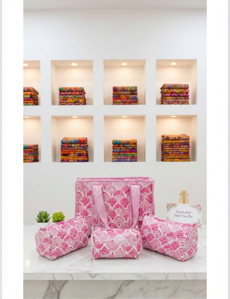 Handcrafted Quilted Cotton Tote Bag Canvas Lining Zipper Closure Lightweight Design 3 Toiletry Pouches for Travel Shopping