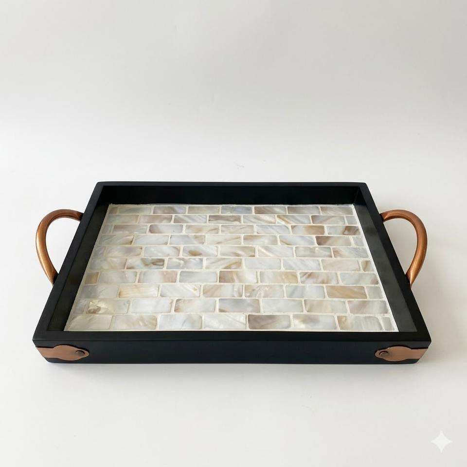 Handcrafted Rattan Serving Tray With Mother Of Pearl Inlay Woven Decorative MOP Shell Tray With Handles For Home & Hotel Use
