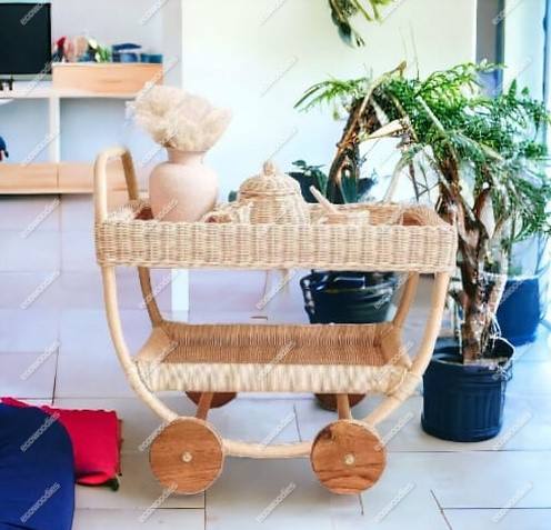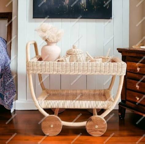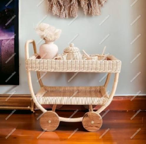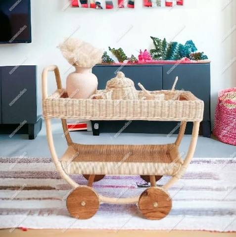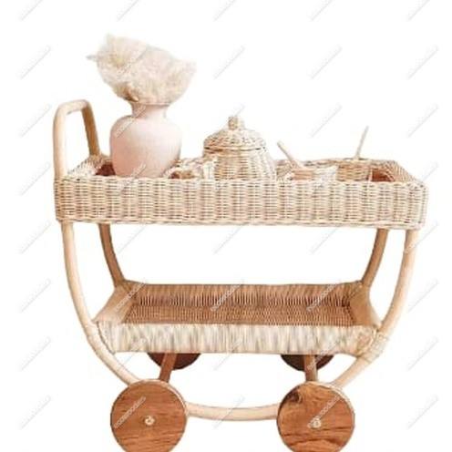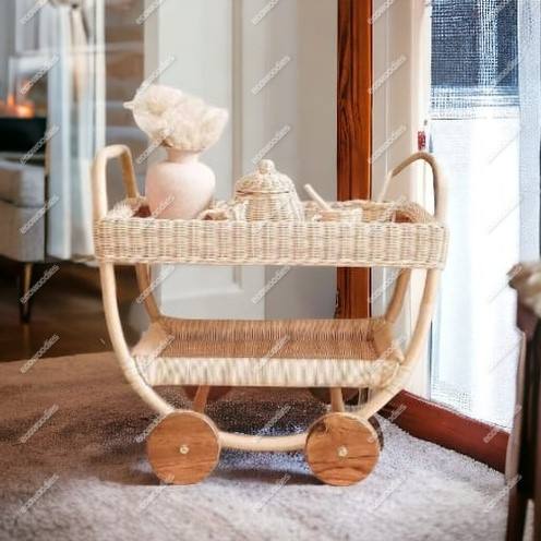 Eco-Friendly Handcrafted Rattan Tea Cart Sturdy Wonderful Children Toys Pretend Play Wicker Tea Trolley Baby Strollers Prams