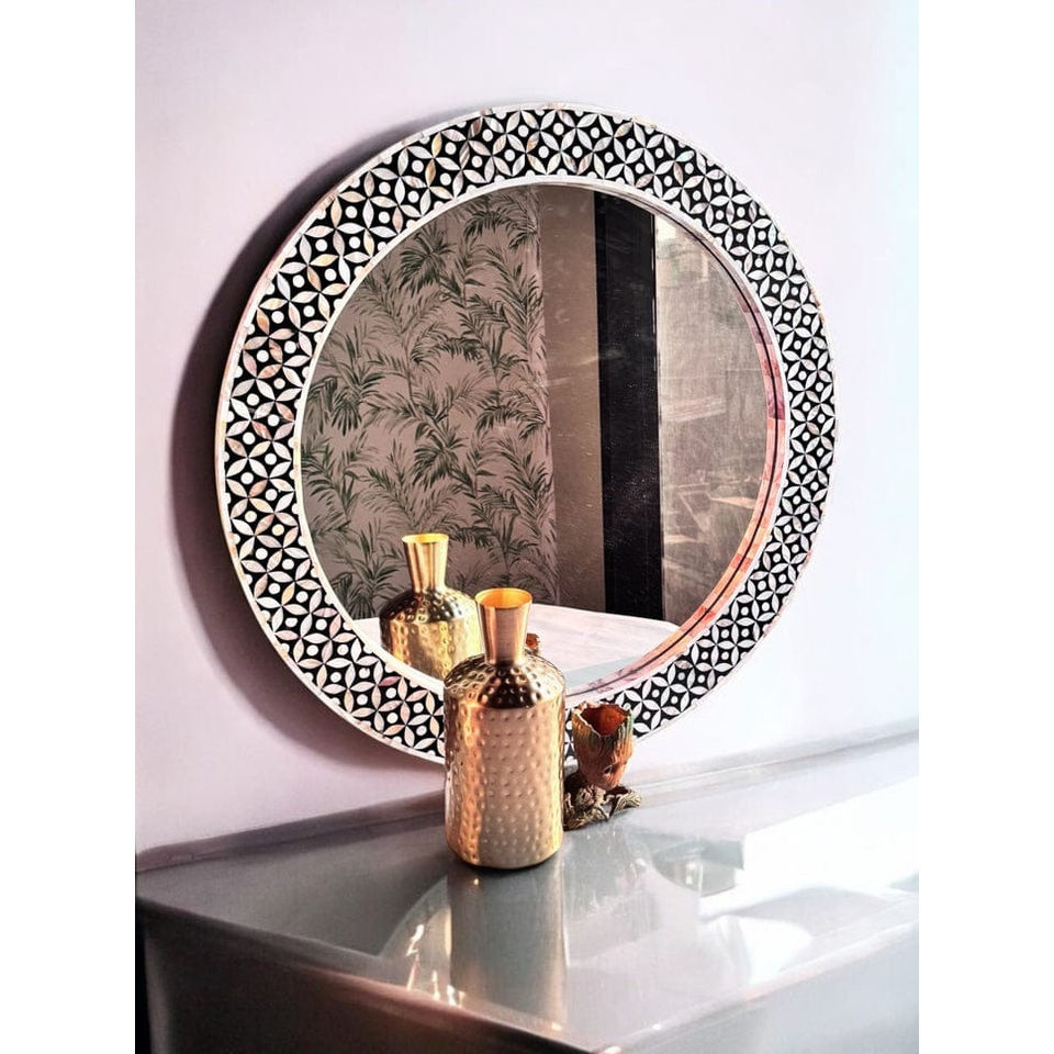 Handcrafted Rectangular Bone Inlay Modern Wall Mirror | Black & White Geometric Floral Decorative Vanity Mirror for Home Decor