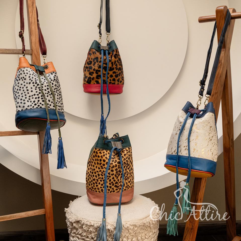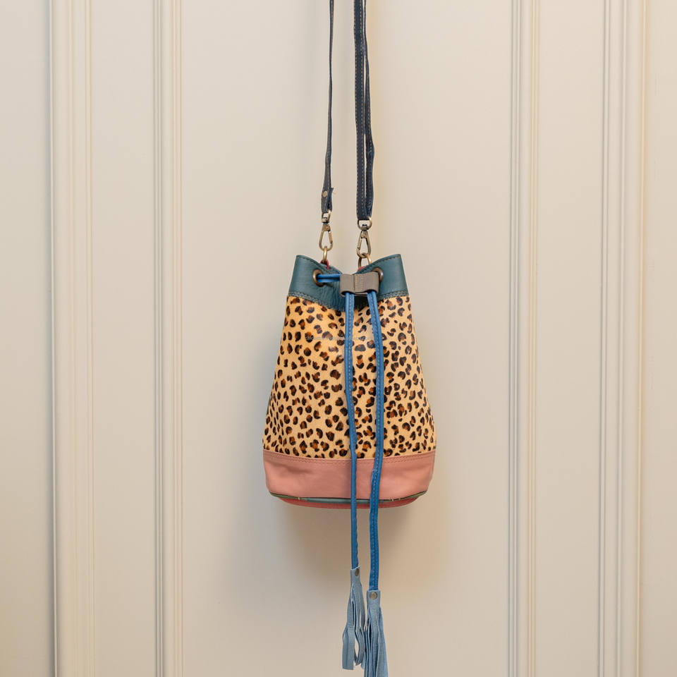 Handcrafted Recycled Leather Crossbody Bucket Bag Boho Festival Style Leopard Print Western Purse Drawstring Handbag for Women's