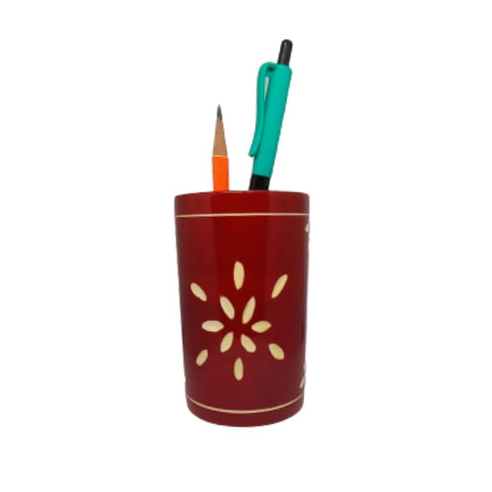 Handcrafted Red Flower Carved Wooden Cylinder Pen Pencil Holder Desk Organizer for Office School Home