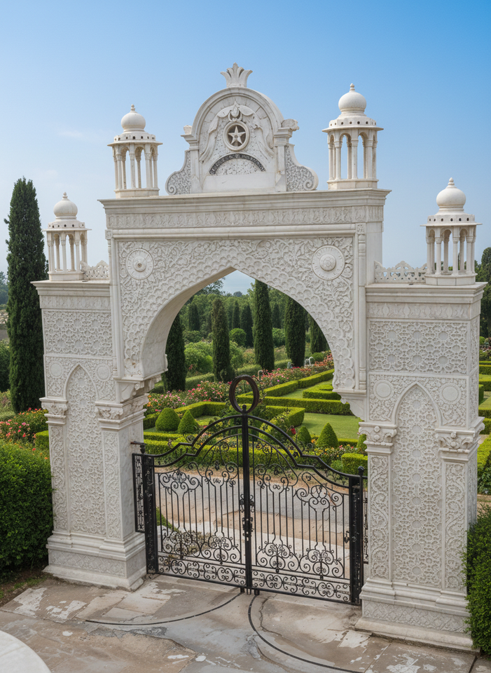 Handcrafted Retractable Marble Islamic Entry Arch Gate Crescent Crown Traditional Relief Carving for Industrial Mall Hospital
