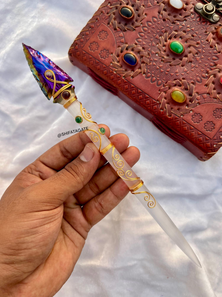 Handcrafted Magic Crystal Knife Selenite & Aura Quartz Wire Wrapped Arrowhead Wand for Energy Healing & Metaphysical Use