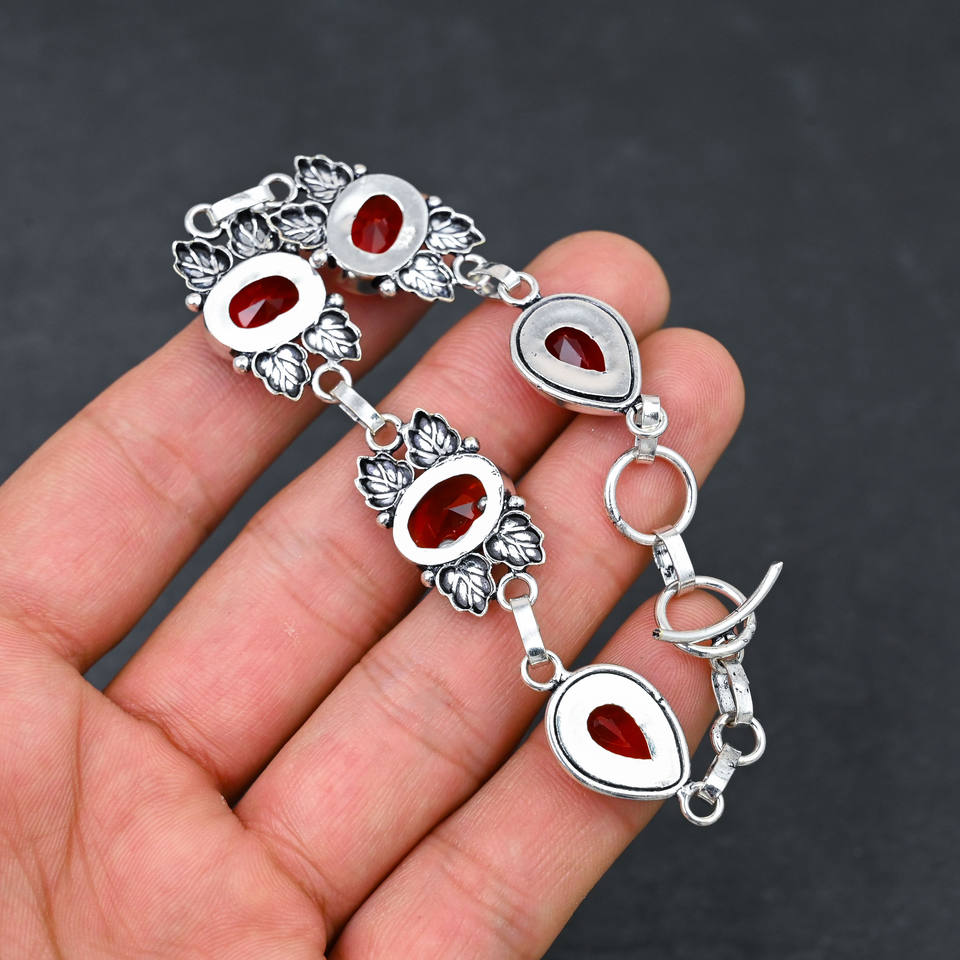 Handcrafted Silver Plated Bracelet with 5 Oval 10x14 MM Lab Created Red Garnet Stones Perfect Gift for Women