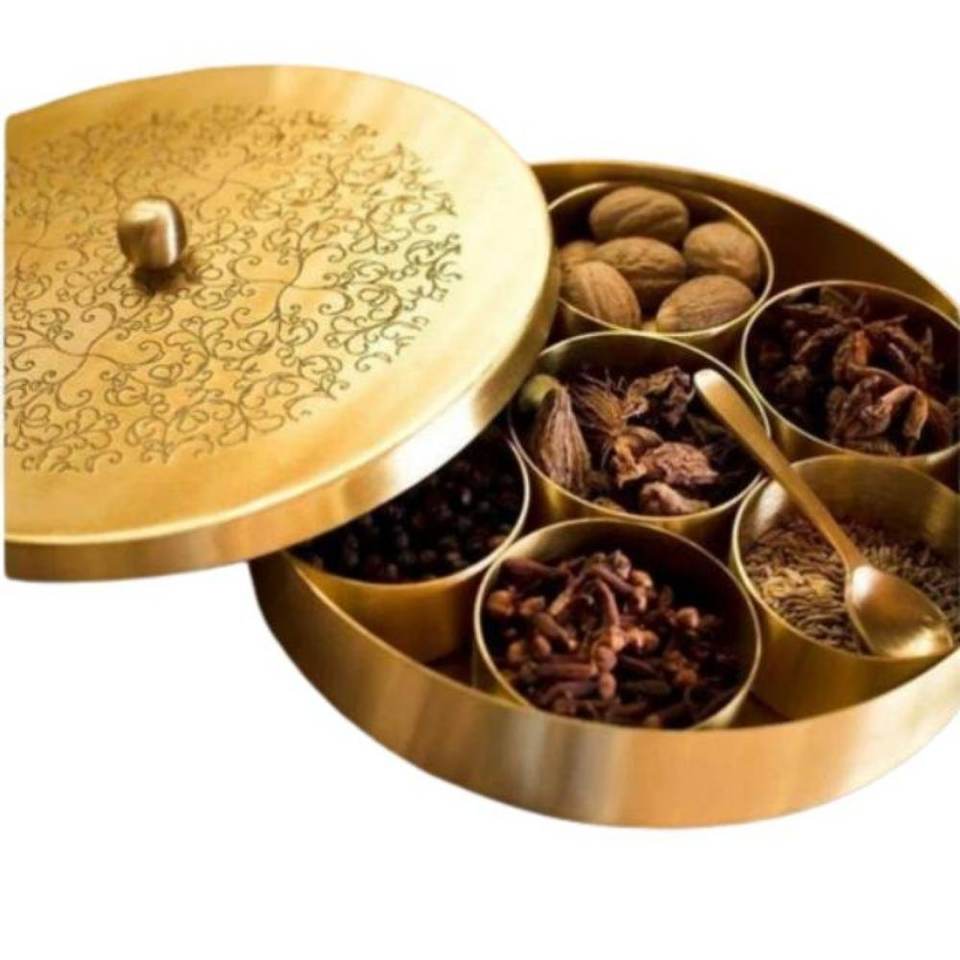 Handcrafted Vintage Eco-Friendly Spice Box in Brass with Spoon 7 Containers 100 ML Kitchen Accessories Gold Color Plated
