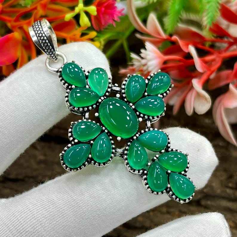 Handcrafted Sterling Silver Green Onyx Cross Pendant Fashion Jewelry Unique Design IGI Certified Gift for Women