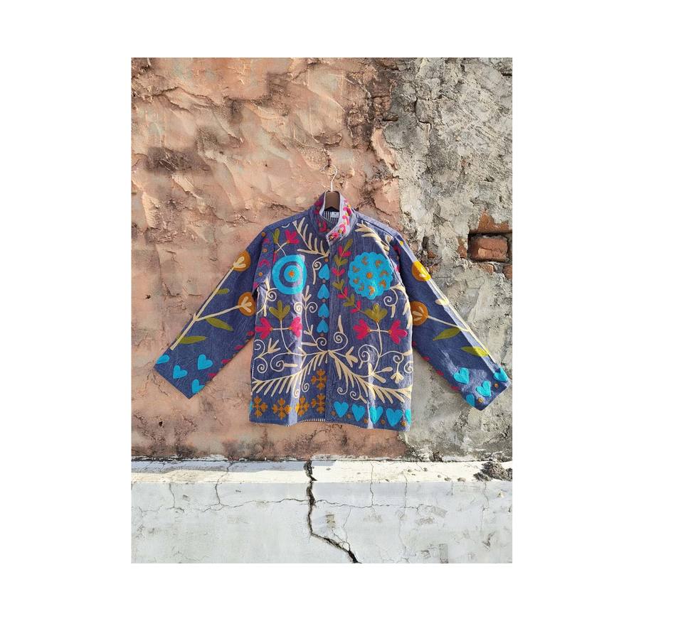 Handcrafted Suzani Denim Jacket: Boho Floral Embroidered Outerwear