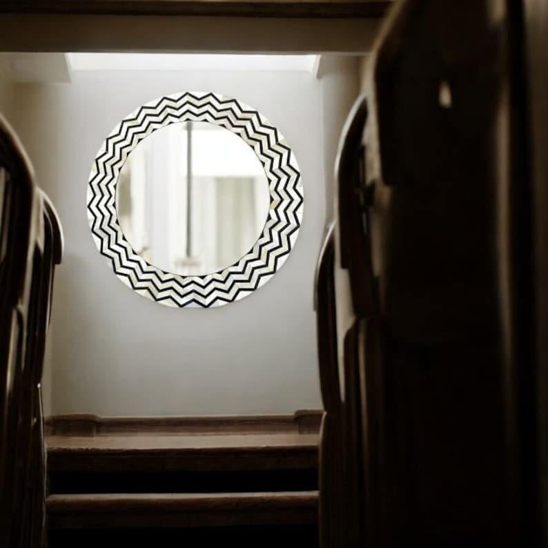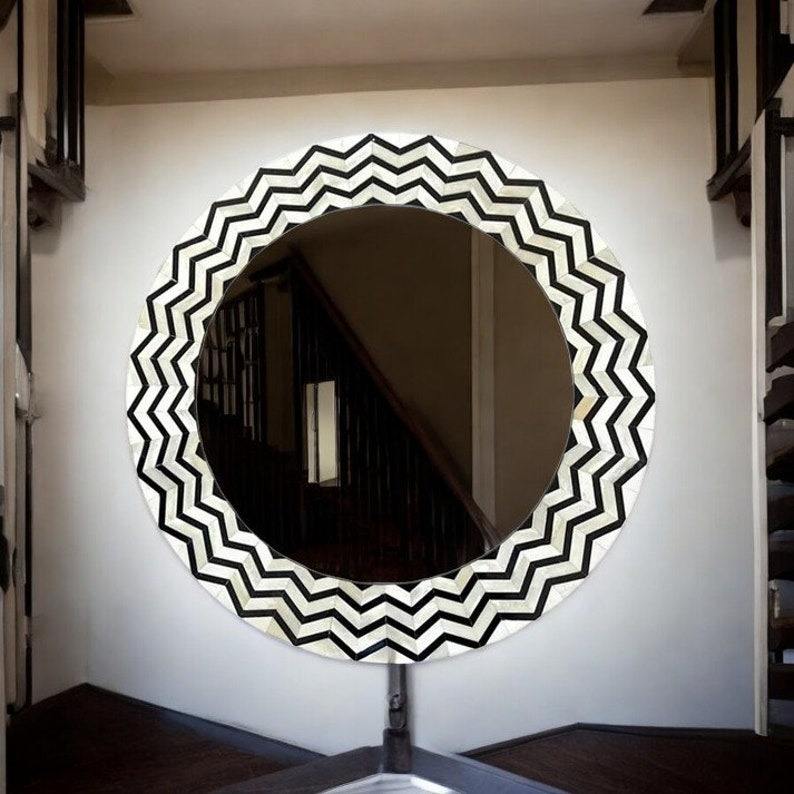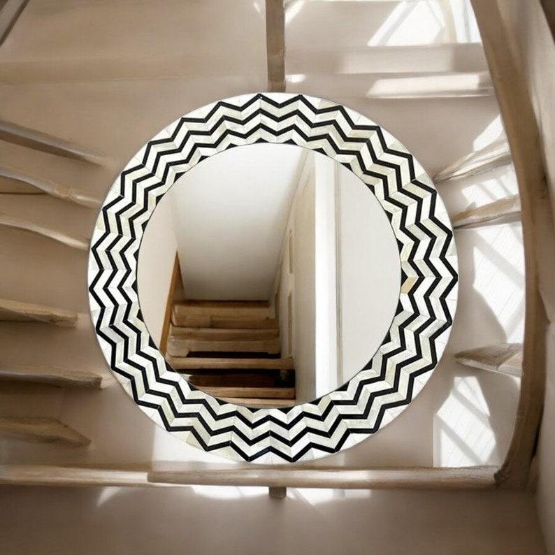 Handcrafted Traditional Design Black and White Floral Bone Inlay Frame Wall Mirror Round Mirror Bathroom Bedroom Decor