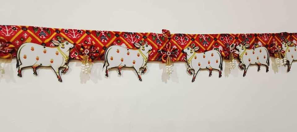 Handcrafted Traditional Rajasthani Fabric Wedding Decorations Vibrant Cow Motif Toran Bandhanwar Wooden Kamdhenu Cutouts Pearl