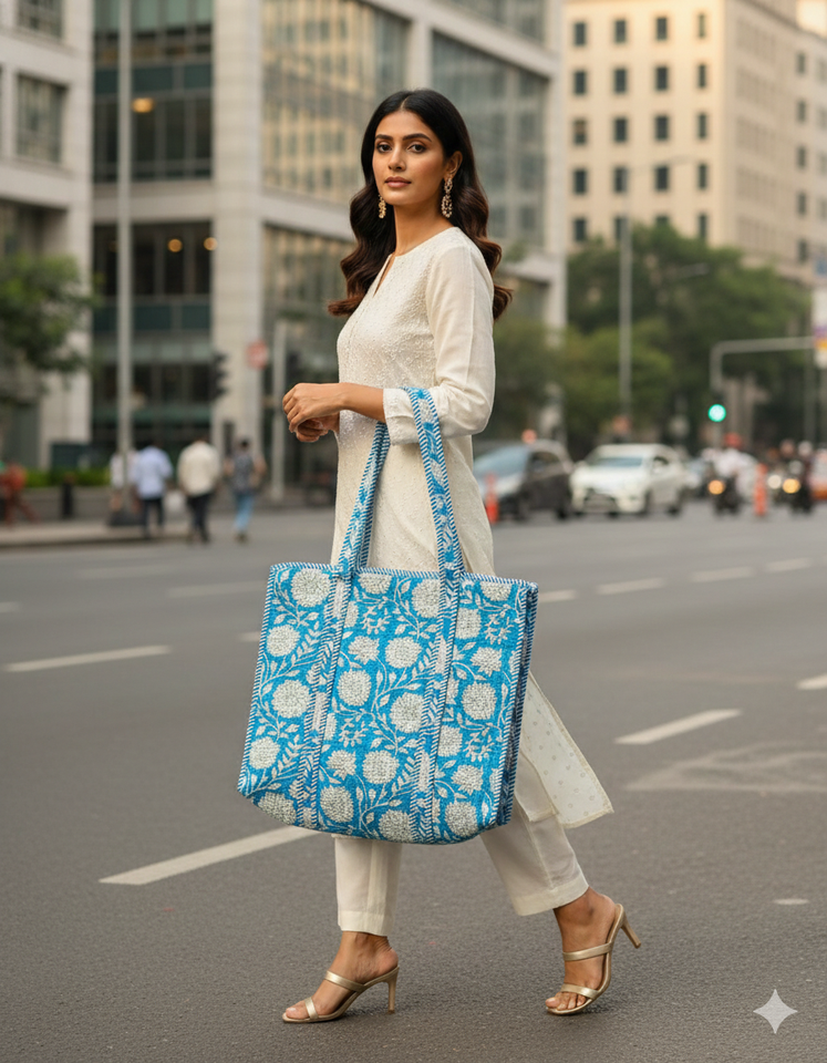 Handcrafted Turquoise Floral Quilted Cotton Tote Bag Premium Ethnic Indian Block Print Large Capacity Women Shoulder Handbag