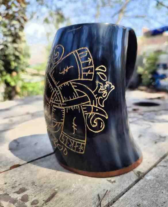 Handcrafted Viking Tankard Drinking Horn Mug Natural Buffalo Horn with Hand Carved Logo Polished Animal Style