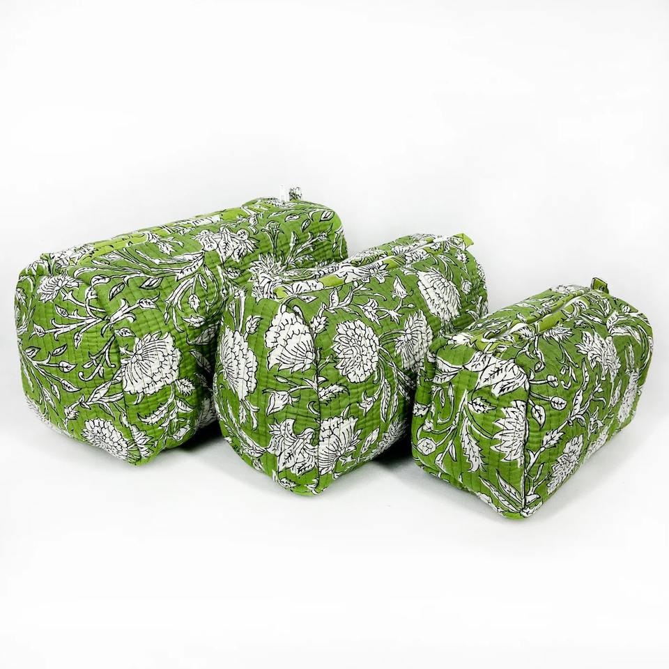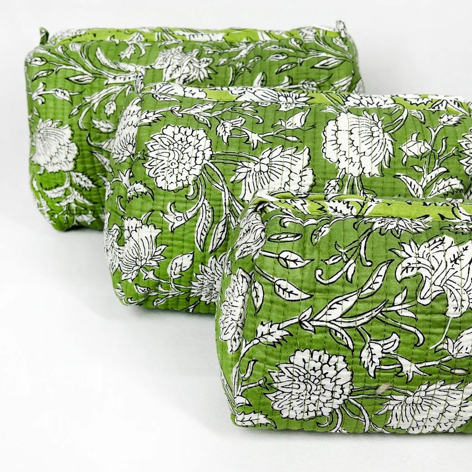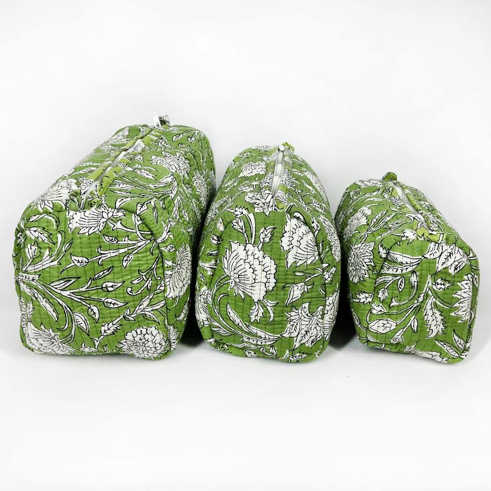 Handcrafted Vintage Style 3-Piece Cotton Travel Makeup Pouch Set Large Eco-Friendly Floral Botanical Block Print Water Resistant