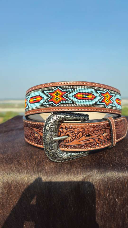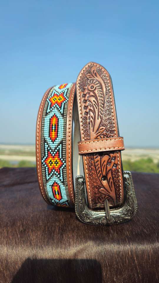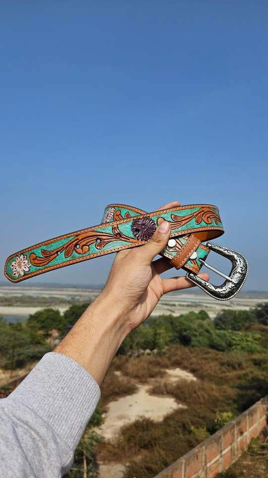 Handcrafted Western Fashion Accessories Intricately Tooled Leather Belt with Vintage Buckle