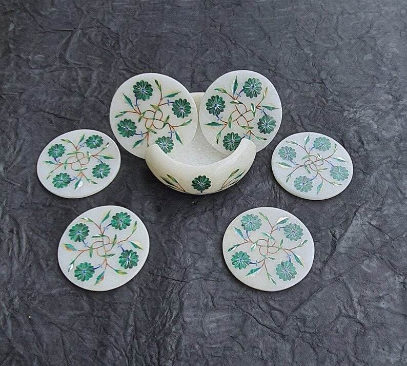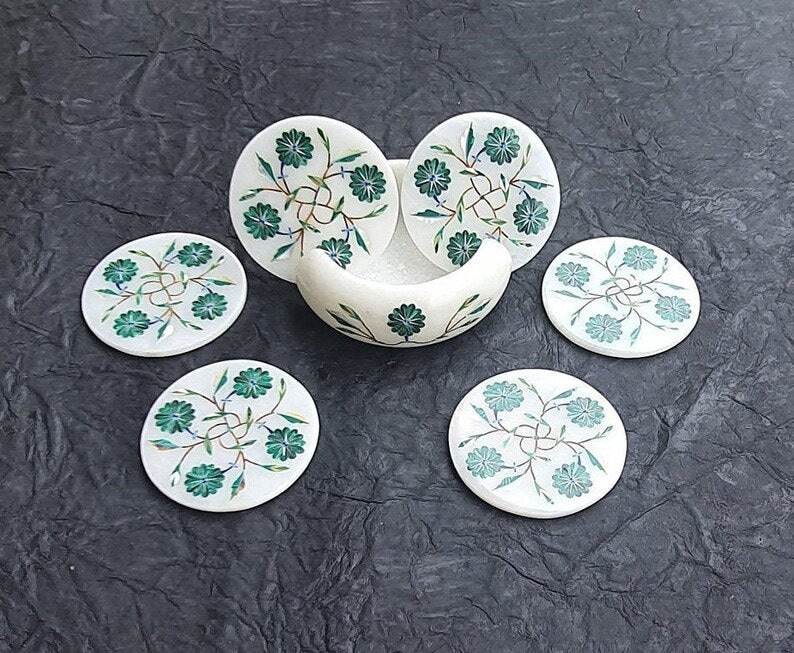 Handcrafted White Marble Inlay Tea Coasters Set Of 6 Natural Stone Crystal Drink Coasters