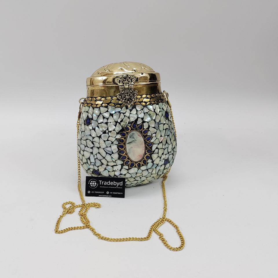 Handcrafted White Mosaic Clutch Blue Accent Stones Vintage Inspired Ornate Lid Gold Chain Strap Pearl Fashionable for tradebyd