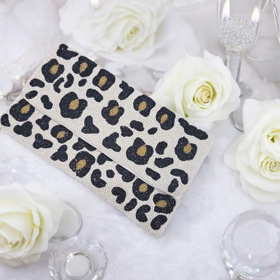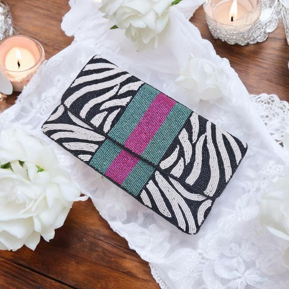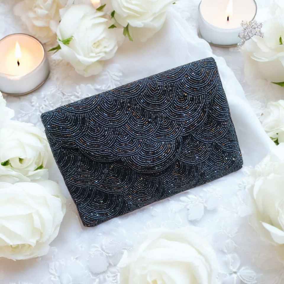 Handcrafted Women Bohemian Beaded Evening Bag Black Bronze Accents Art Deco Wave Pattern Autumn Vintage Embroidery Travel