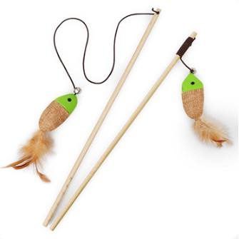 Handcrafted Wooden Handle Fishing Rod Toy for Cats with Fish and Feather Combo