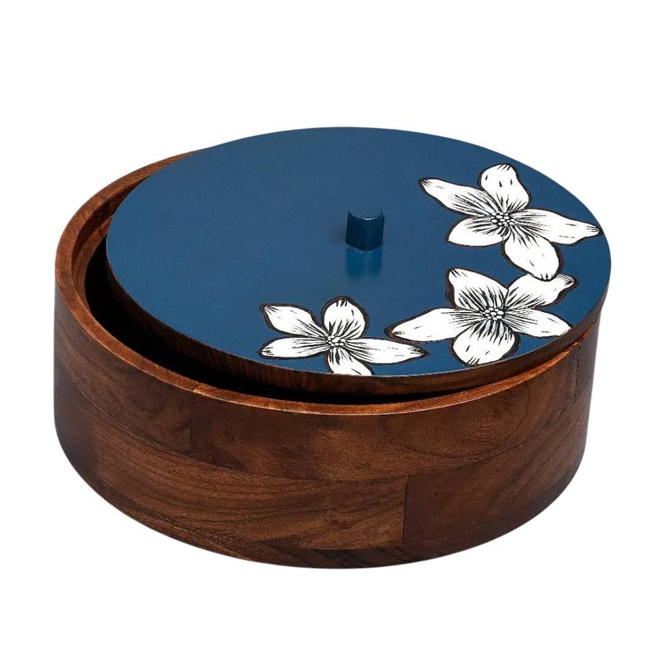 Handcrafted Wooden Hot Pot Roti Box with Floral Printed Lid Solid Wood Chapati Casserole for Kitchen Storage & Dining Table