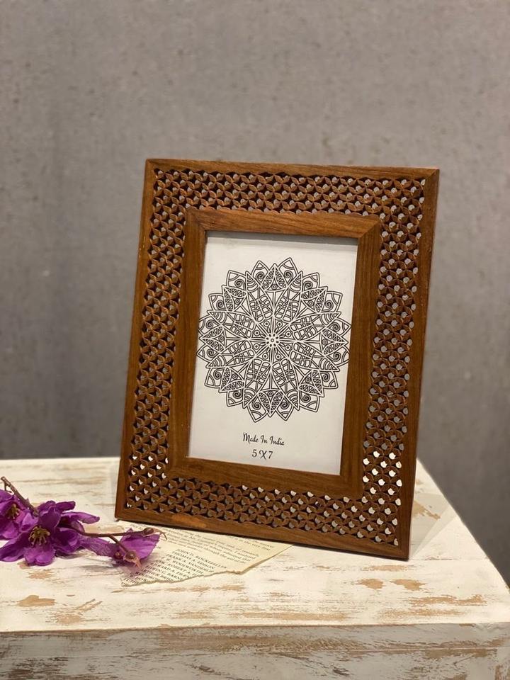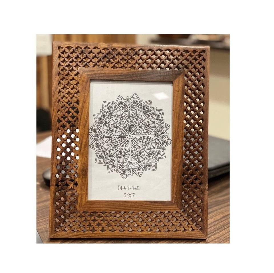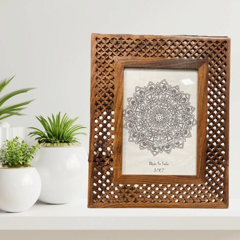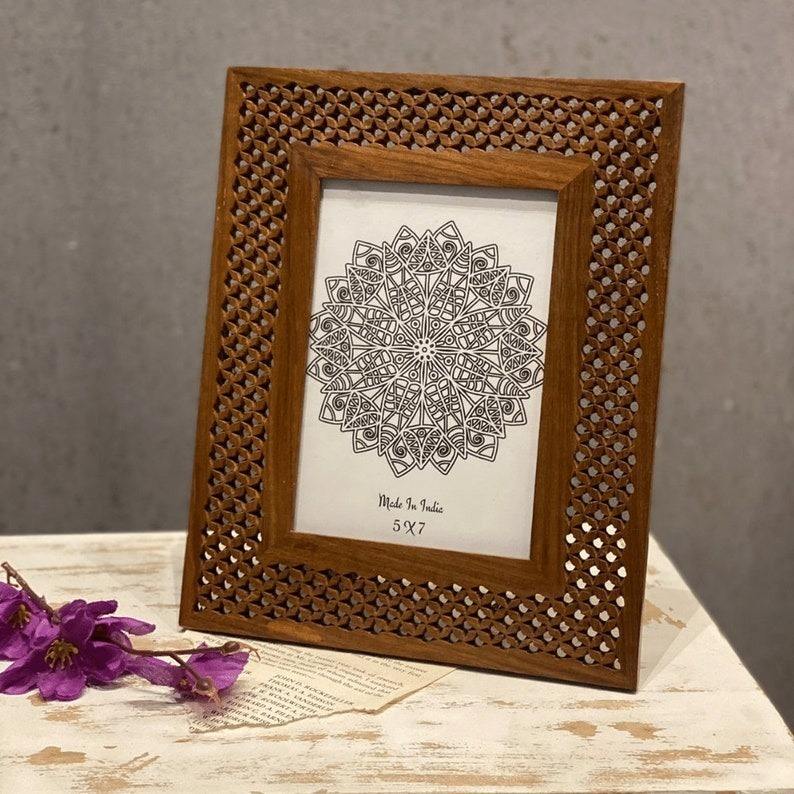 Handcrafted Wooden Photo Frame with Intricate Carved Lattice Design for Home and Office Decoration