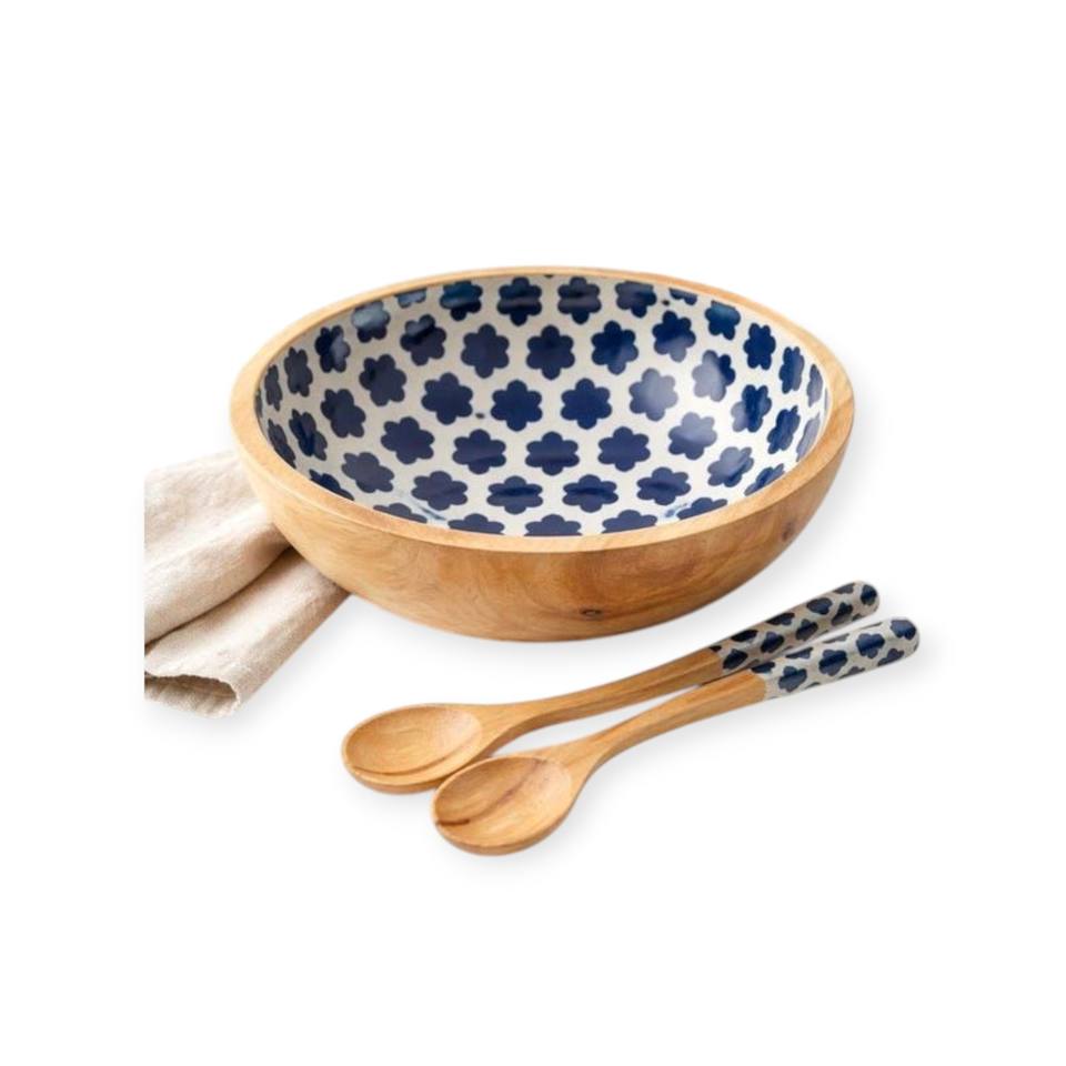 Handcrafted Wooden Salad Bowl with Blue Floral Enamel Interior and Matching Wooden Spoons for Elegant Dining Table Decor Bloom