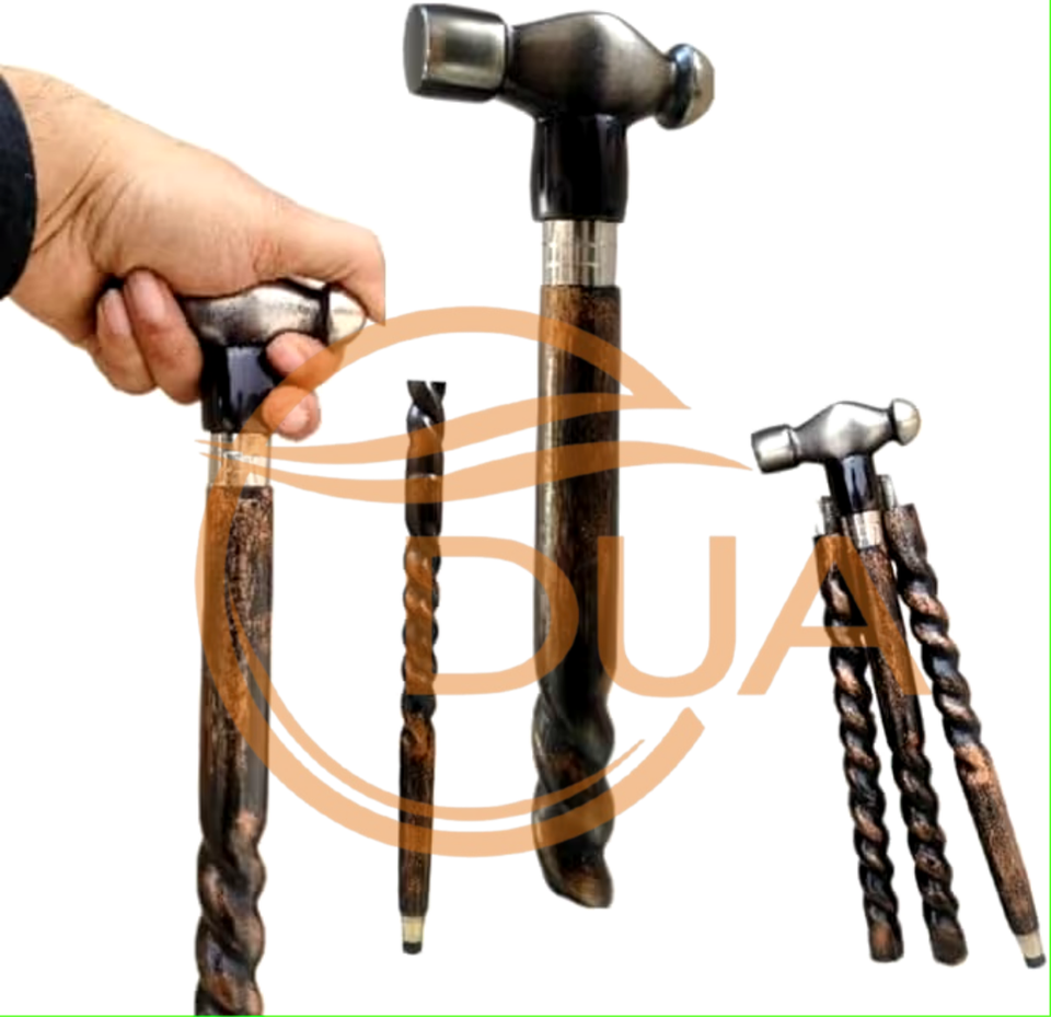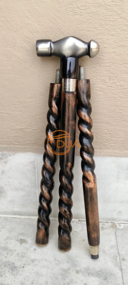 Handcrafted Wooden Spiral Walking Stick with Metal Hammer Handle | Vintage Foldable Cane for Hiking Support & Gift Uses