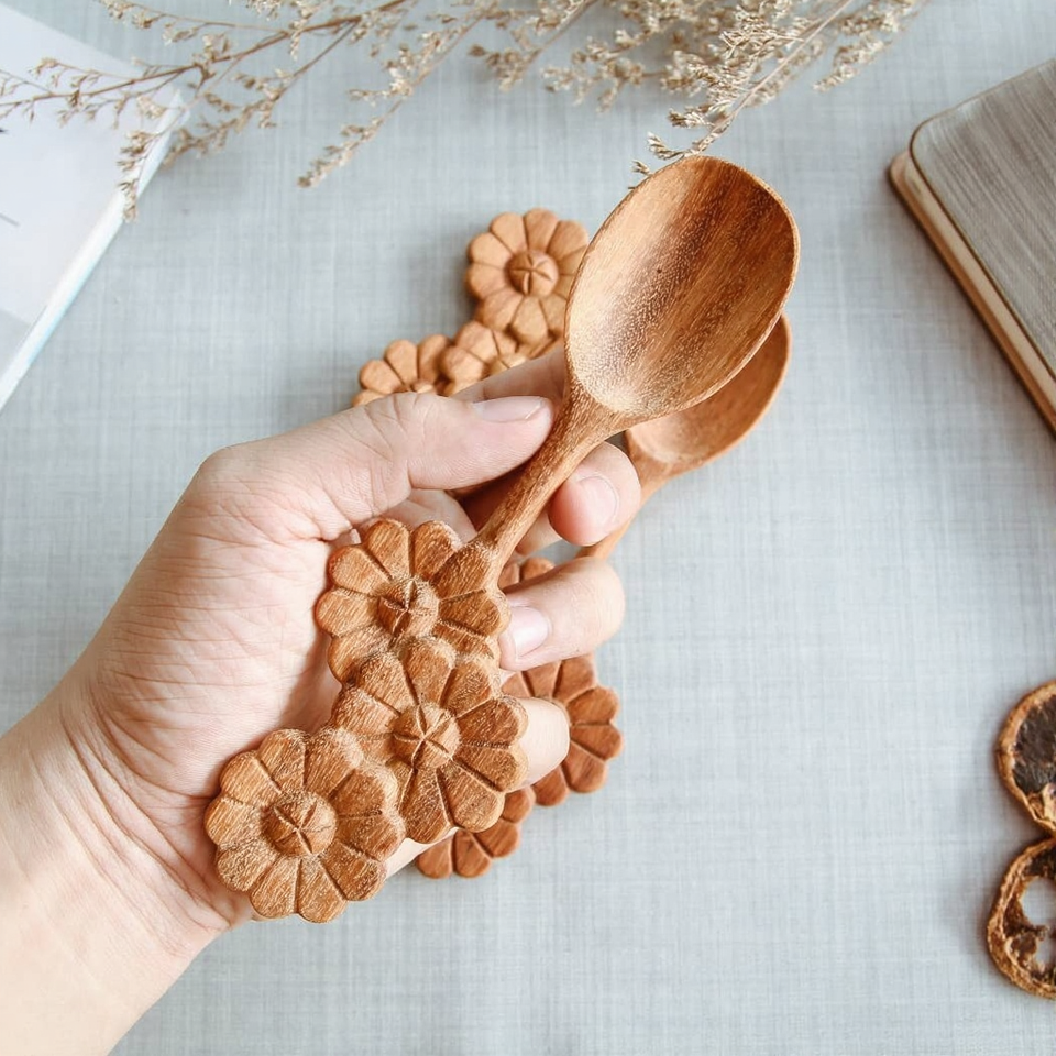 Handcrafted Wooden Spoon with Floral Carving Natural Eco-Friendly Decorative Table Spoon