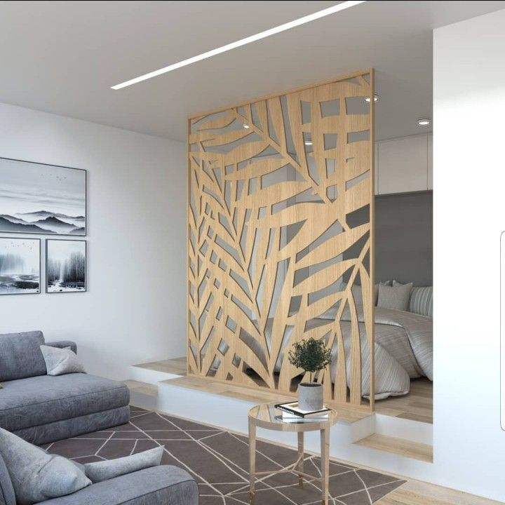 Handcrafted artistic wood partition wall perfect for visually dividing open floor plans in a charming manner