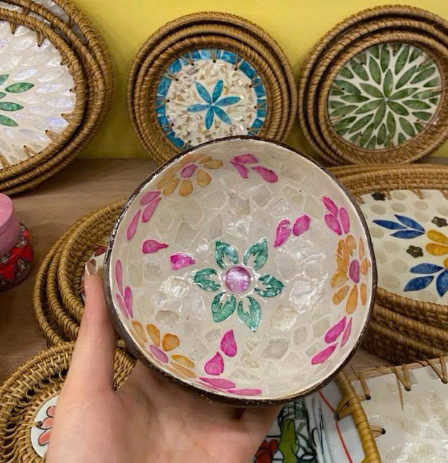 Handcrafted bamboo coconut shell bowl with shimmering mother of pearl lacquer used for dining decor made in Vietnam
