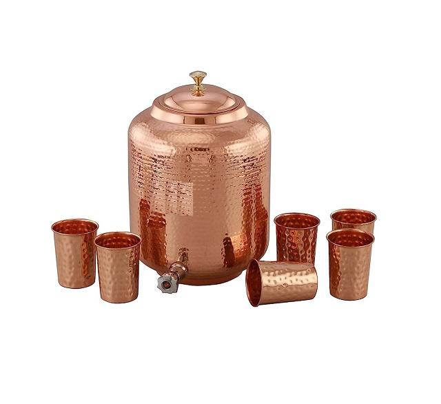 Handcrafted copper water dispenser with unique engraved design suitable for daily hydration and health improvement at home