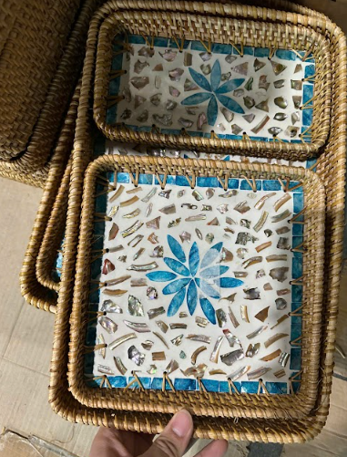 Handcrafted natural rattan tray set with mosaic inlay for home decoration and serving