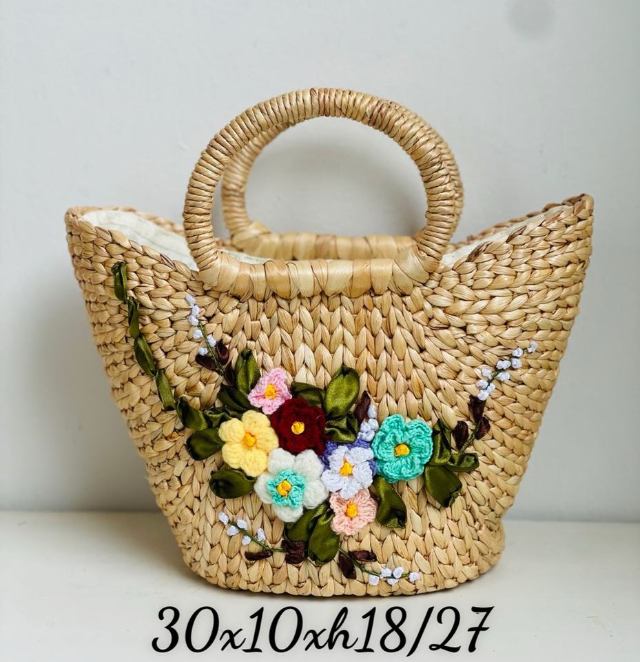 Handcrafted Natural Water Hyacinth Eco-Friendly Floral Handbag Unique Gold Ingot-Shape Design Open Closure Two Handles for Beach