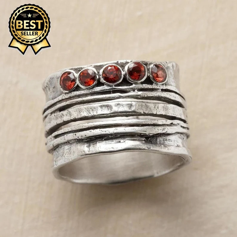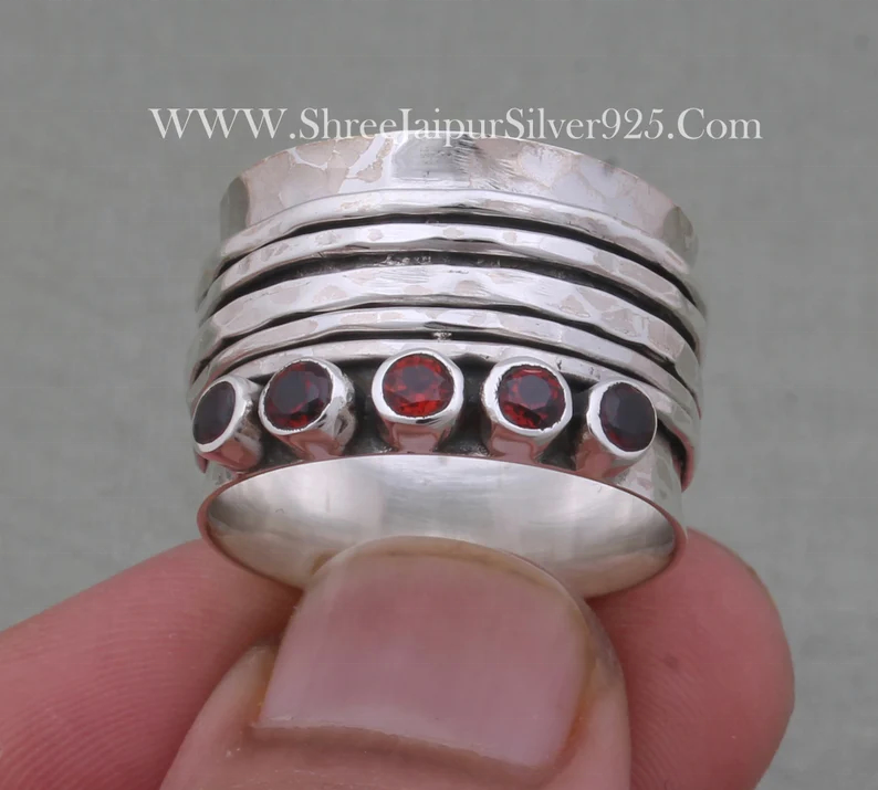 Handcrafted Small Sterling Silver Brass Spinner Ring with Red Garnet Carving Boho Meditation Worry Ring for Women for Weddings